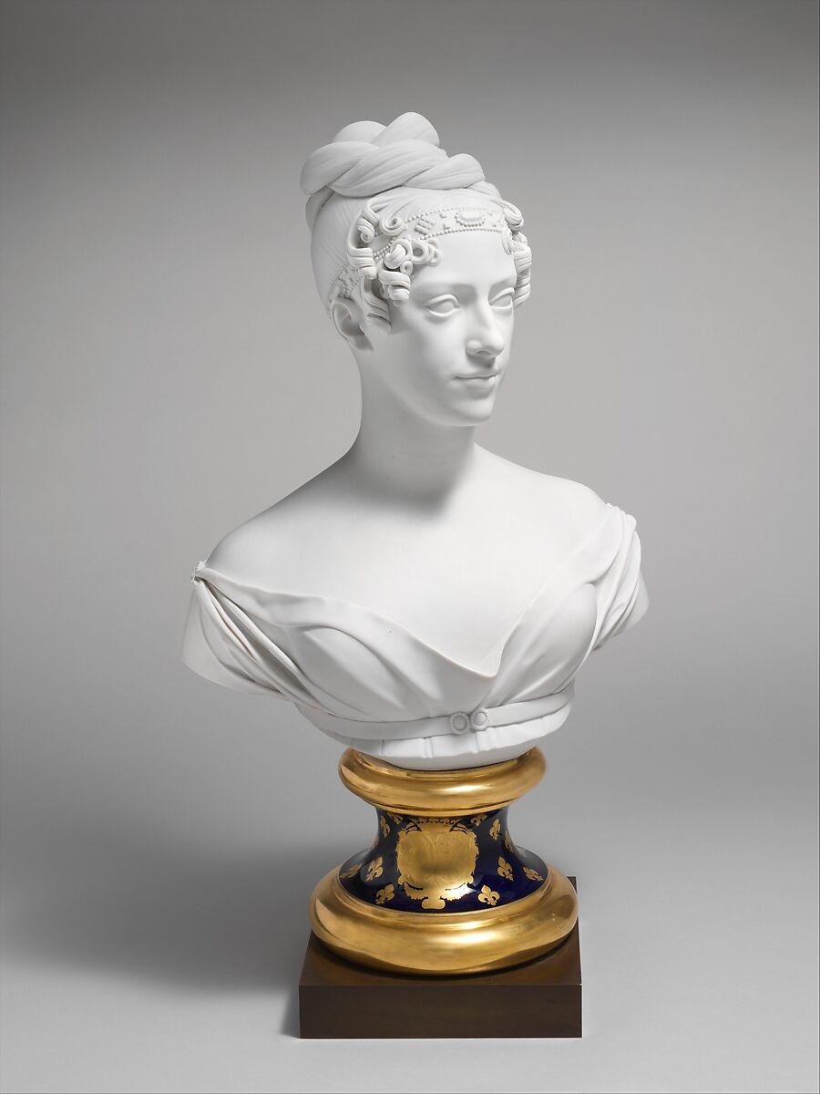This bust appears to be the most ambitious piece of porcelain produced by the Paris factory of Auguste Dominique Denuelle. It is based on a marble bust by the sculptor Henri Joseph Ruxtheil (1755–1837) and depicts Marie-Caroline, the duchess of Berry. A daughter of King Francis I of the Two Sicilies, Marie-Caroline married Charles Ferdinand, the duke of Berry, whose father became Charles X in 1824. Charles Ferdinand was assassinated four years before his father ascended the throne, and Marie-Caroline was forced to flee France when her father-in-law was overthrown in the July Revolution of 1830.