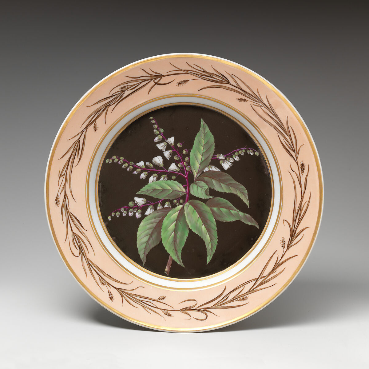 A fashion for botany swept Europe at the end of the eighteenth century, when botanical designs were used to decorate porcelain services. This plate design is closely related to the service that the Berlin royal porcelain manufactory (Koenigliche Porzellan Manufaktur) created for Josephine Bonaparte beginning in 1809. Like all true botanical services, this plate, which features a lily of the valley, identifies the scientific nomenclature of the plant, “Clethra arborea,” on the reverse side.