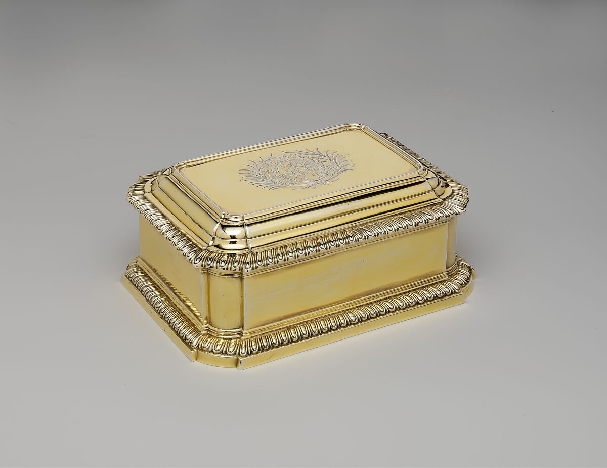 These boxes were part of a toilet service sold by the leading London retailers Parker and Wakelin to John Heathcote, who, a few years earlier, had married the heiress Lydia Moyer. Parker and Wakelin’s accounts for the sale show that the service included eight such boxes, a pair of candlesticks, two "essence pots," a looking glass, a "jewells trunk," and a pair of octagonal pierced trays. The cost for gilding the service was more than £56—roughly equal to the annual wage of a successful artisan—and the entire bill came to more than £300. There was a further charge of £6 6s for a "red morocco leather case with a drawer & 2 cushions."