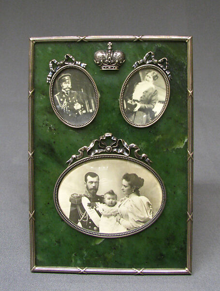 These three picture frames are part of a gift to the Museum of twenty-four frames made in the Moscow and Saint Petersburg workshops of the famous House of Carl Fabergé by the several brilliant and talented jewelers the firm attracted in the decades around the turn of the twentieth century. The divergent framing devices for the then-popular medium of presentation portrait photography were among the firm’s most sought-after creations, and this group of frames covers nearly the entire spectrum of techniques, materials, and imaginative shapes Fabergé offered his affluent clientele. As the Romanov dynasty’s favorite artisan, Fabergé made objects that accompanied members of the Russian high aristocracy from cradle to grave. Besides the fanciful examples illustrated here, two of which are decorated with the