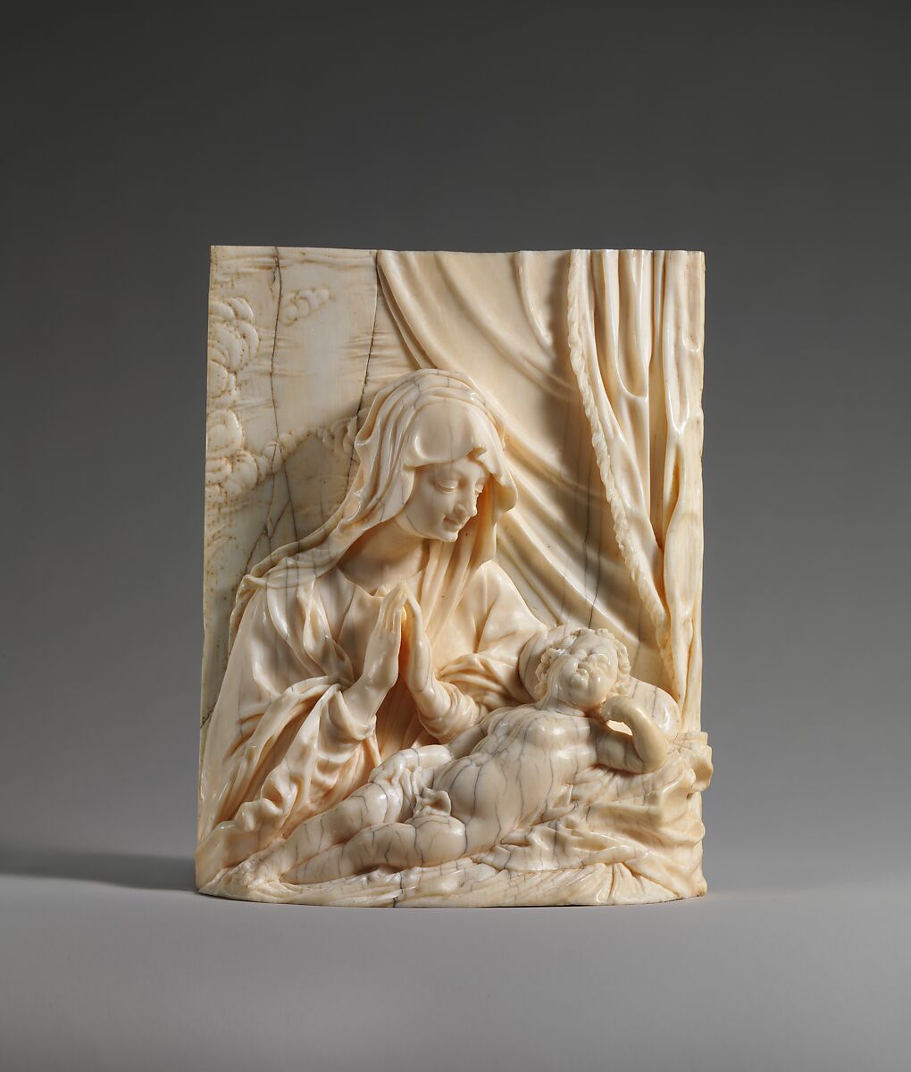 Kriebel, one of the few North German sculptors, carved this plaque from a single piece of ivory. He took advantage of the material’s softness to create a background of clouded sky. Paper thin and translucent, the ivory allows light to pass through and illuminate the Madonna’s downturned head as she gazes adoringly at her sleeping child’s peaceful face. The pair’s smooth skin is enhanced by the surrounding folds of layered drapery of the Madonna’s clothing and of the blankets cradling the infant Christ.