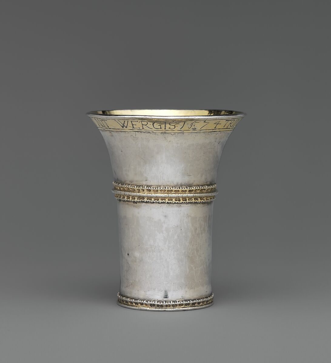 The Salgo Collection contains two examples of an extremely rare beaker of a graceful type that has its roots in the Hungarian Gothic period. Most such beakers were melted down, but a few were part of hordes hidden during turbulent times and only recovered in the nineteenth and twentieth centuries. All of these beakers have a simple trumpet-shaped form with an applied gilded and pierced girdle above the middle section. The German inscription on the lip reads, "Drink and don’t forget God your Lord 1574."