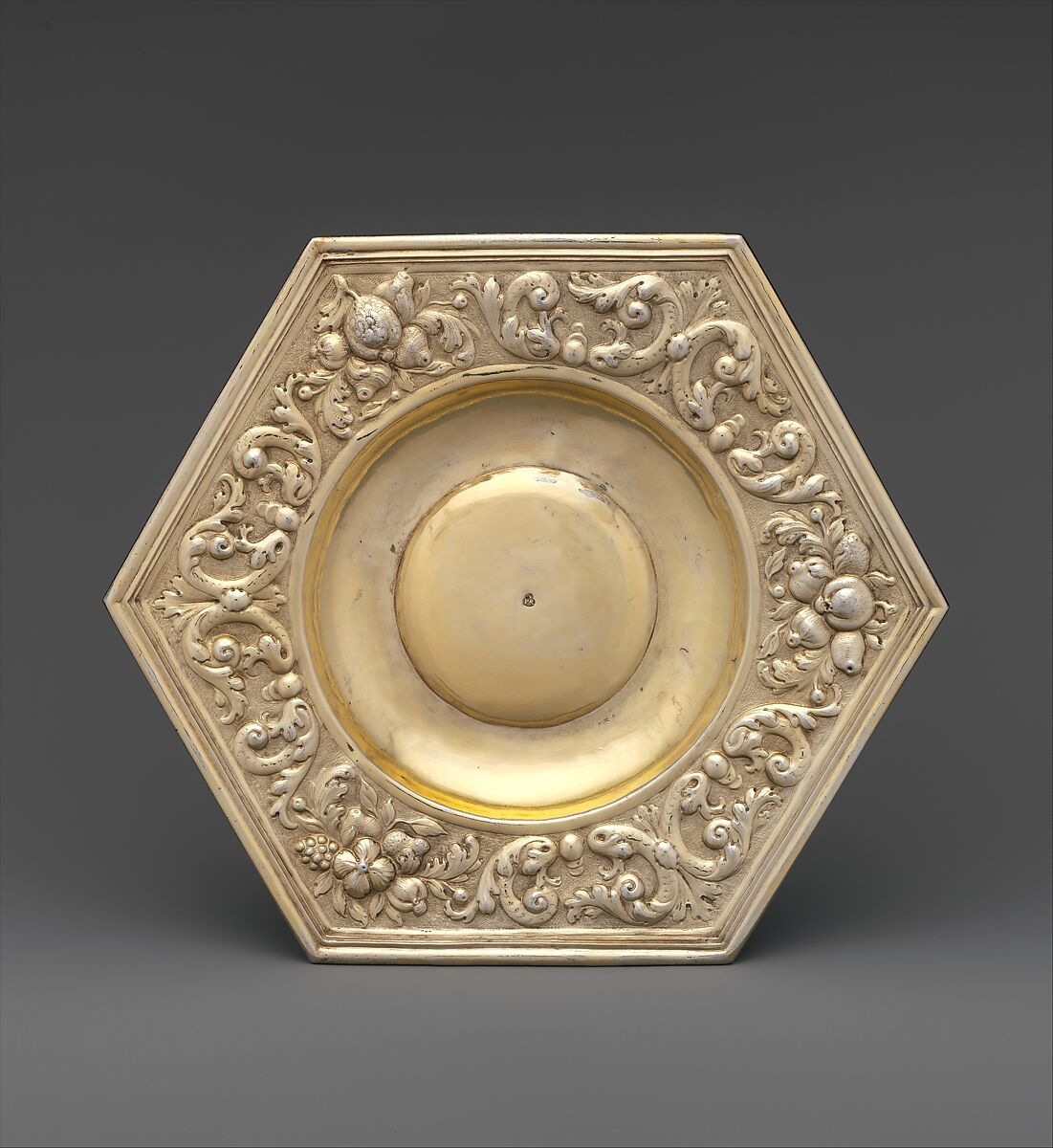 A German hexagonal dish with floral decoration in the border, bearing the mark of David Bessmann, Augsburg, circa 1660, was sold by Christie's, London, July 8, 2015, no. 35.