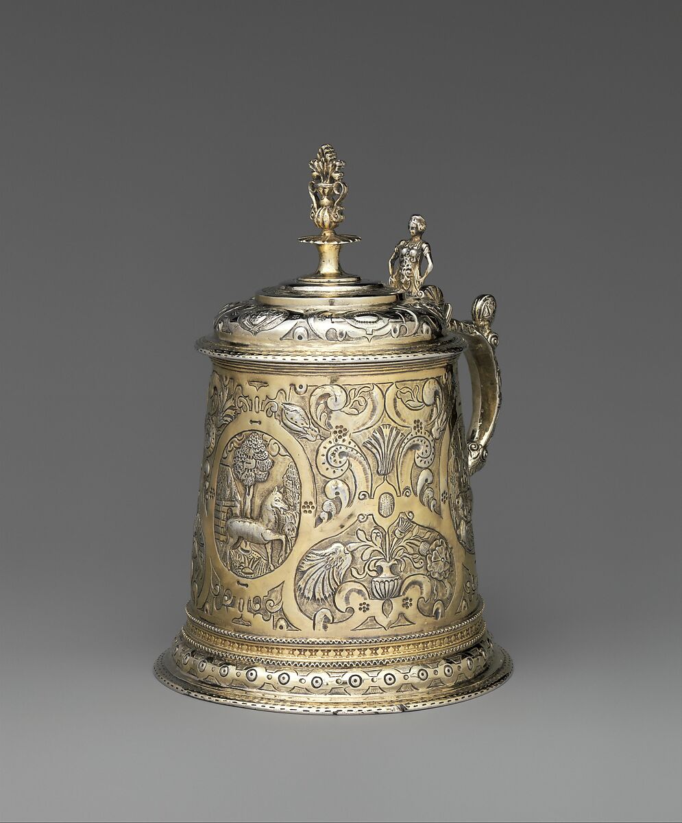 Prints were a key source for Beri in fashioning this tankard. Its form was made popular through the printed designs of Bernhard Zan. Scrollwork cartouches frame three oval reliefs filled with animals: a unicorn before an urban structure, a grazing horse in a landscape, and a recumbent lioness or panther near a well and tower. These animal scenes follow prints from a Thierbuch (or book of animals), published by Jost Amman and Hans Bocksberger in Frankfurt in 1579, that was an especially common source for metal-workers.