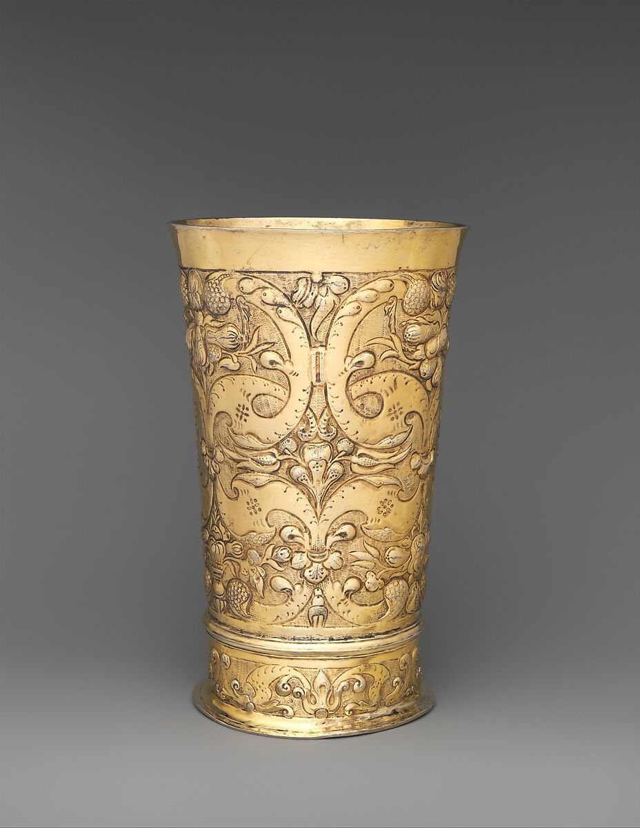 This substantial beaker could hold large quantities of wine. The polished scrolls and fruit clusters that project from a matte ground evoke a feeling of abundance that reflects the beaker’s lavish function. Similar auricular (literally "ear-shaped") scrollwork can be seen on the lidded example to the left. This beaker may also originally have had a cover. An auricular-style scrollwork ornament, which originated in the Netherlands in the early seventeenth century (Antje-Maria van Graevenitz. Das niederländische Ohrmuschelornament. Bamberg, 1973), similar to that decorating this voluminous beaker can be seen on a lidded example from the collection, acc. no. 2010.110.38.