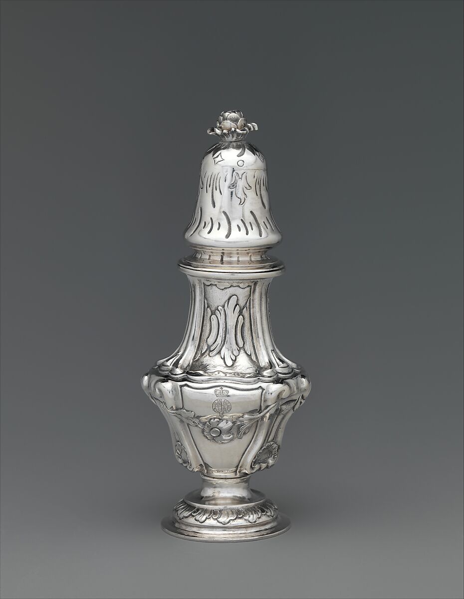 Sugar was a rare commodity in the eighteenth century and often surrounded by ceremony. The sugar caster, acc. no. 2010.110.59a, b, with its pierced domed lid, forms a matching pair with the mustard pot, 2010.110.60, with its hinged lid and a slot for a ladle. Sets like this one were very rare on the European continent, which may indicate that the goldsmith or patron was familiar with English silver, where these types were more common. Italian and Austrian Baroque architecture clearly inspired the powerful, bulging outline of this vessel. The engraved arms refer to the family of the Princes of Reuss (Younger Line).