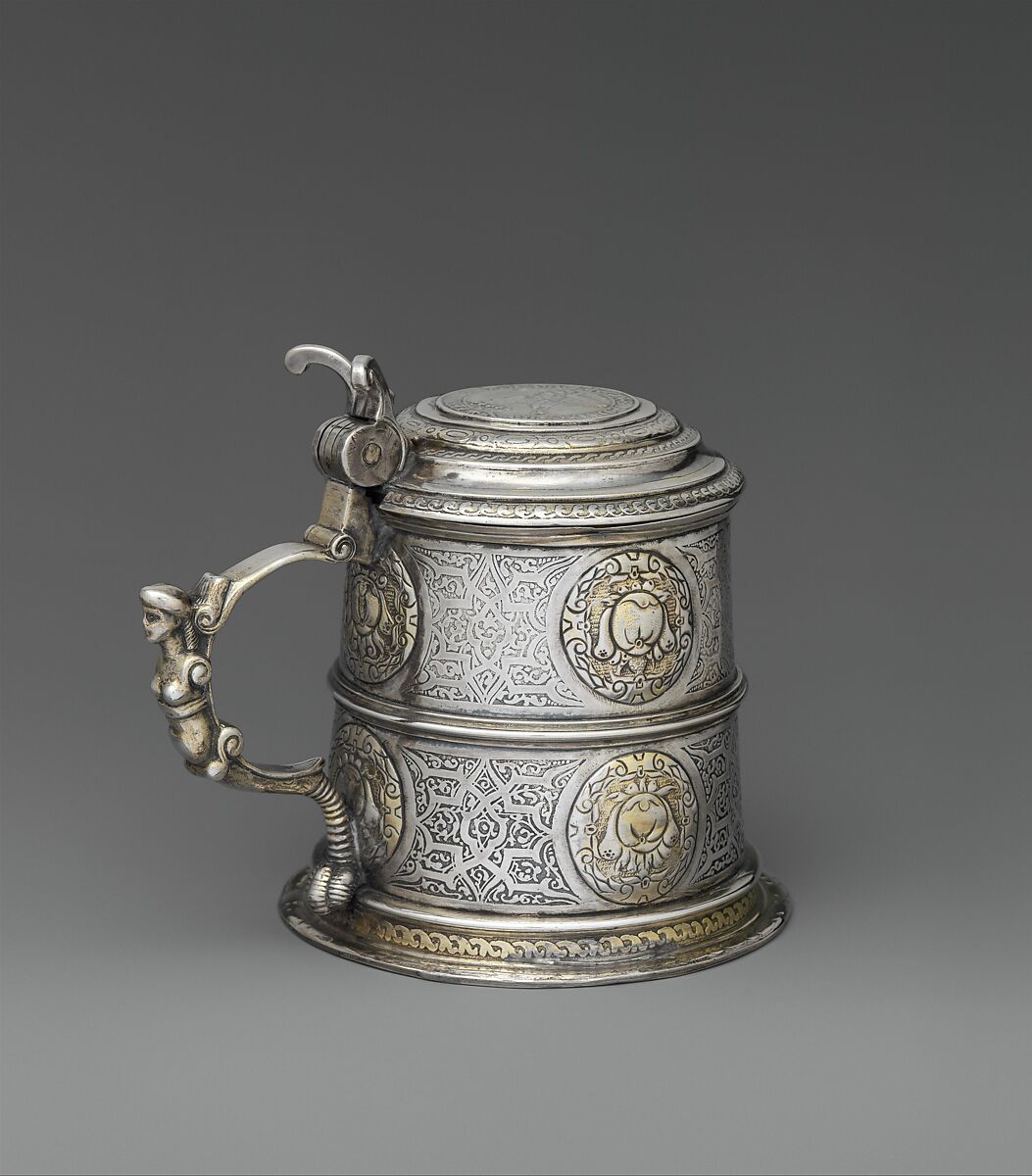 The decoration is an example par excellence of the influence of Arabic ornaments on Hungarian goldsmiths’ work. The etched Moresque motifs were distributed through pattern books throughout Europe (I. Gerelyes. "Islamic Influences in the 16th and 17th Century, Hungarian Metalwork" in Folia Archaeologica XLIV (1995), pp. 206–7, figs. 11, 12; Stefano Carboni, ed., Venice and the Islamic World, 828-1797. New York, 2007). One of the great masters of ornamental inventions with Ottoman prototypes was Virgil Solis (Ilse O’Dell-Franke. Kupferstiche und Radierungen aus der Werkstatt des Virgil Solis. Wiesbaden, 1977).The lid of this tankard incorporates a thaler, struck in Kremnica, Slovakia, in 1554. The thaler (from the German thal, or valley) was a silver coin first minted in Bohemia and Saxony around 1518. The term was adapted later in the United States as the dollar. The sides of the vessel are etched with strapwork and arabesque foliage that recalls Ottoman saz patterns.