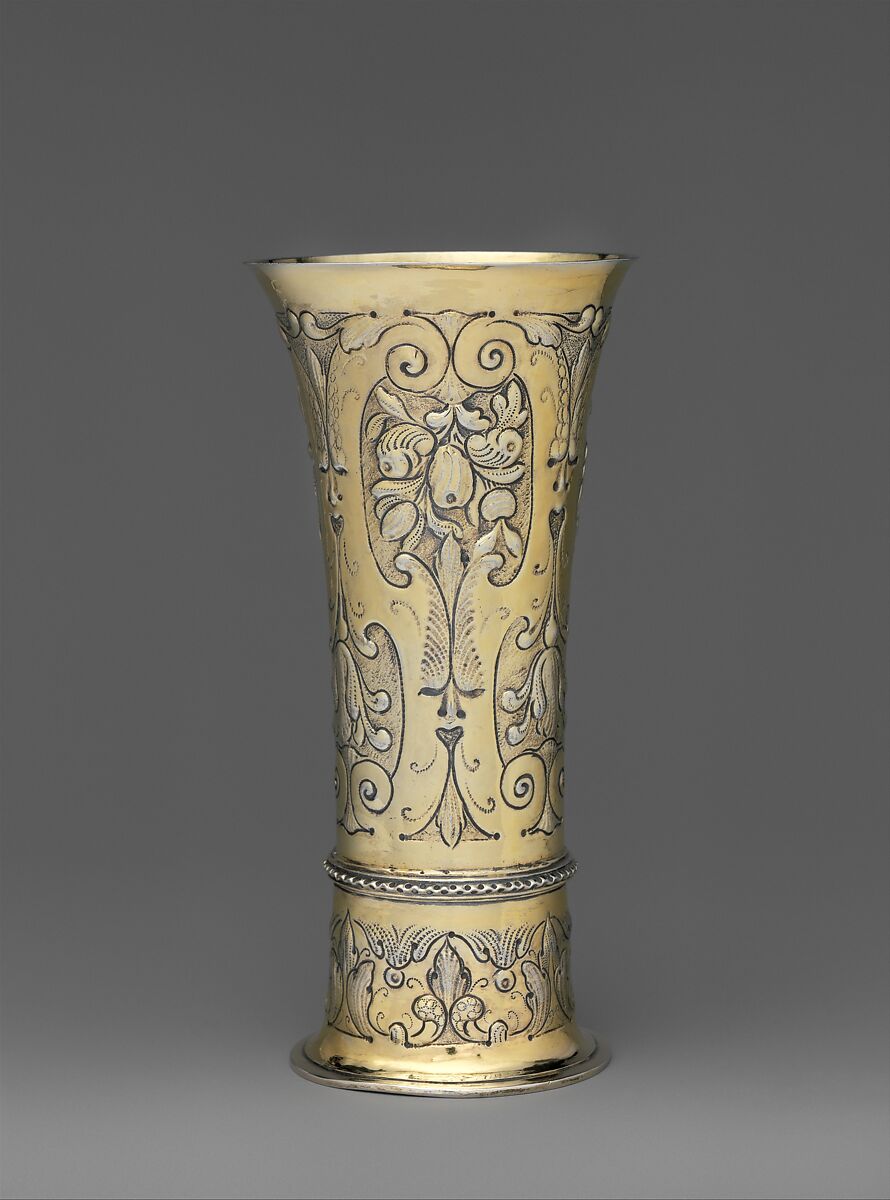 On this beaker, bold auricular scrolls form cartouches with bundles of foliage and fruits. It seems that the goldsmith intended the points where the scrolls meet to evoke a grotesque mask, with punched pyramidal eyebrows above the nostrils, and an open, heart-shaped mouth from which a leaf-shaped tongue emerges.