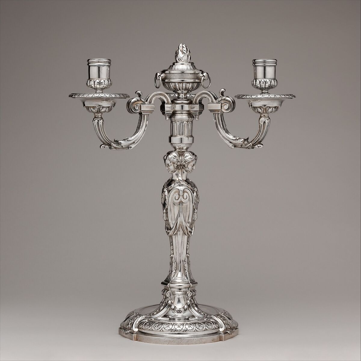 These candelabra (see also 48.187.390a, b) date to an early point in Auguste's career, and they reflect a robust and architectural Neoclassicism in their style. The Neoclassicism of the last two decades of the eighteenth century was often characterized by a highly refined and restrained elegance, with spare decoration. The emerging Neoclassical style of the 1760s usually employed bolder and more sculptural motifs drawn from classical architecture, as can be seen in these candelabra.