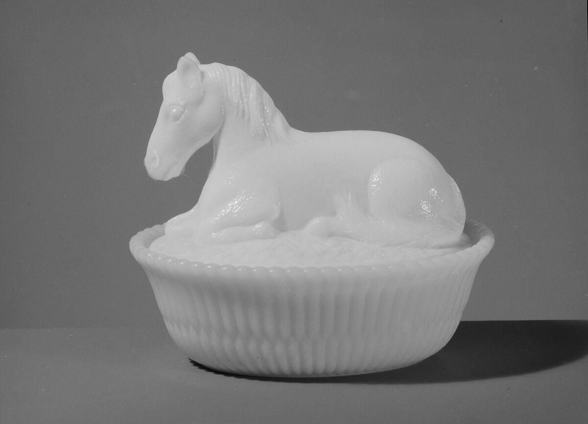 McKee and Brothers manufactured a large quantity of animal-shaped dishes, some of them marked, but most, like this one, unmarked. The overlapping ribs on the base of the dish are characteristic of McKee pieces. This piece has been reproduced.