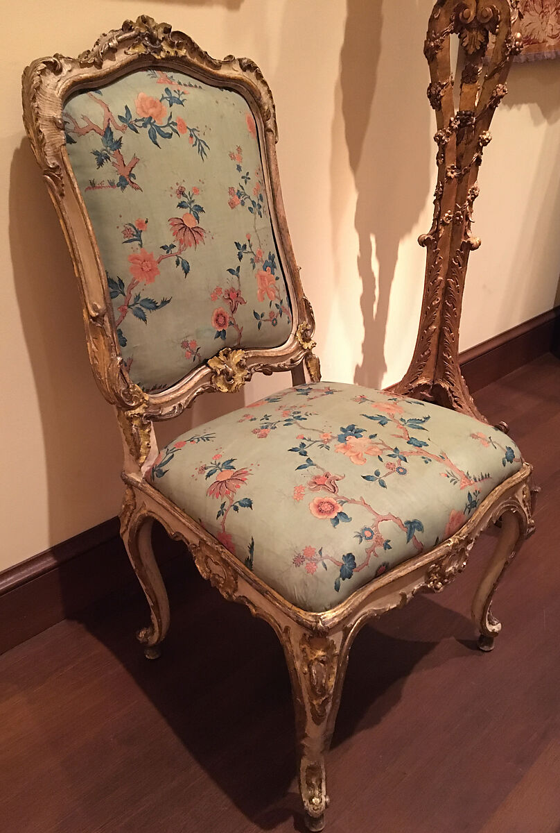 - Medium: Carved, painted, silvered, and gilded pine and beechwood, with printed cotton (not original)