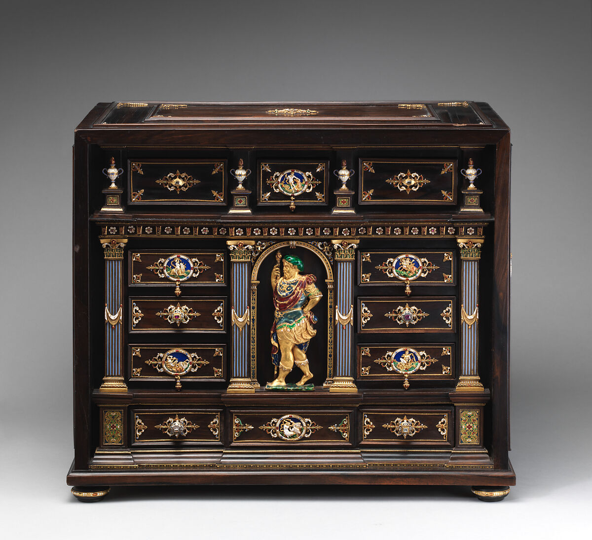 Long considered to be a masterpiece of the late sixteenth century, this cabinet was identified recently as the work of the great nineteenth-century goldsmith Reinhold Vasters, who reused old timber to buidt part of the carcase. It is possible that the central figure represents Hercules. The gold mounts, rendered in a Renaissance style typical of Vasters, depict additional mythological figures.