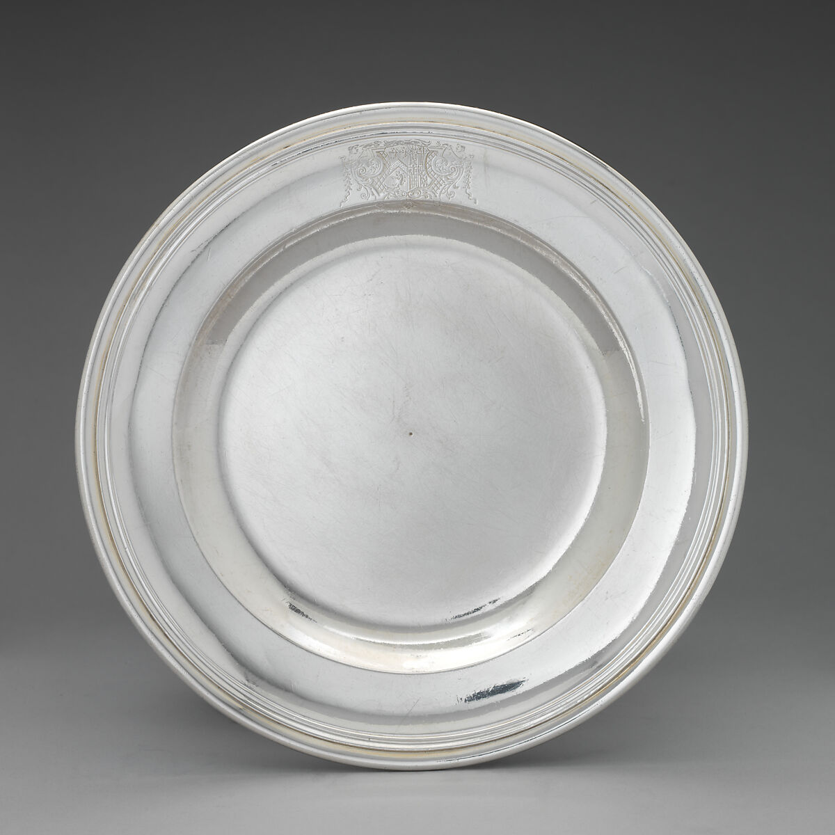Silver dinner plates like these were often supplied in sets of 36, so that 3 courses could be served to a table of 12. The simplicity of this set (consisting of 12 plates) is typical of most British eighteenth-century examples. Their only ornamentation is the heraldry engraved on the rim (where it was less likely to be damaged from the use of forks and knives), which combines two separate coats of arms. This suggests that these plates were commissioned in celebration of a marriage. Each plate has also been stamped with the maker’s mark of Thomas Farren, later the Subordinate Goldsmith to the King.
