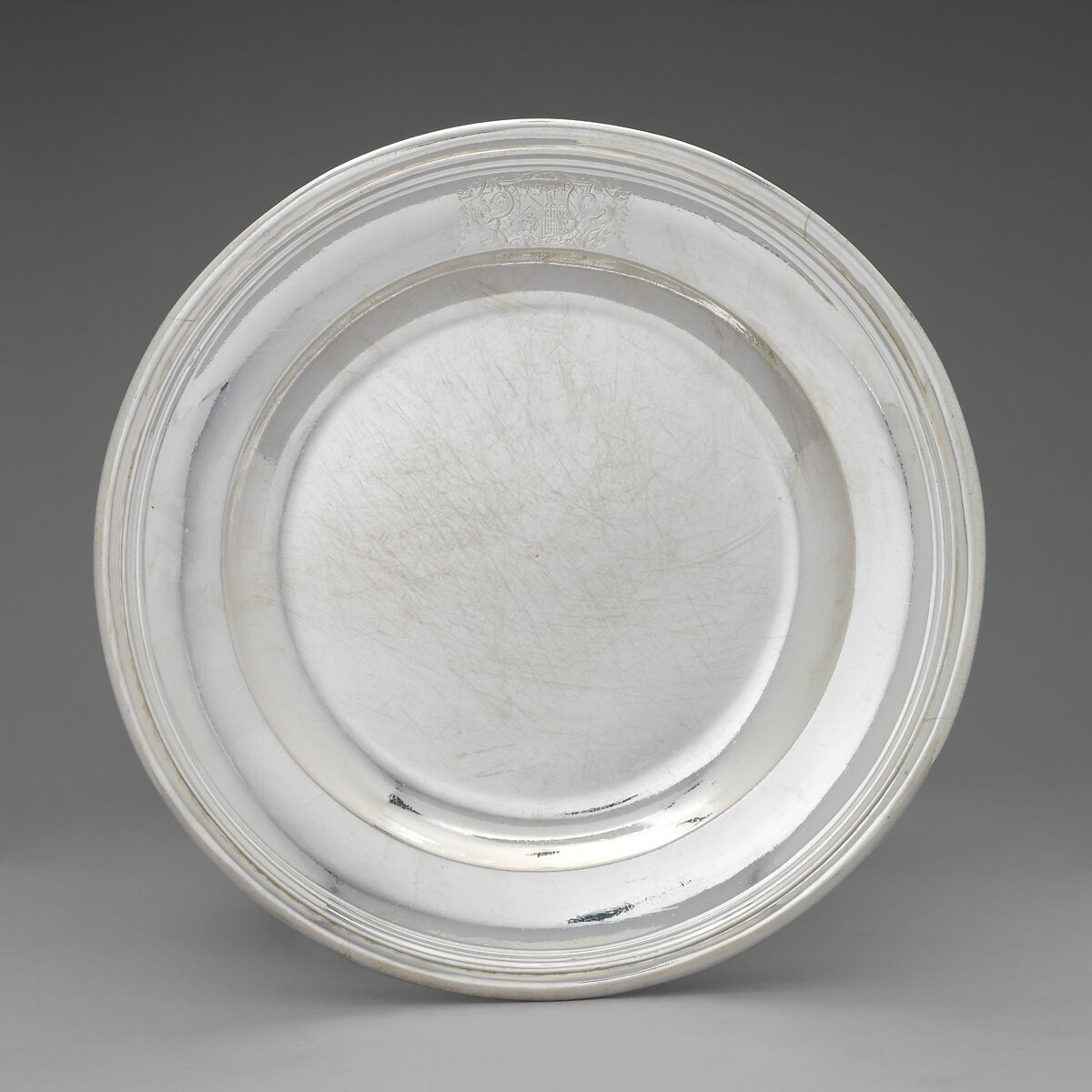 Silver dinner plates like these were often supplied in sets of 36, so that 3 courses could be served to a table of 12. The simplicity of this set (consisting of 12 plates) is typical of most British eighteenth-century examples. Their only ornamentation is the heraldry engraved on the rim (where it was less likely to be damaged from the use of forks and knives), which combines two separate coats of arms. This suggests that these plates were commissioned in celebration of a marriage. Each plate has also been stamped with the maker’s mark of Thomas Farren, later the Subordinate Goldsmith to the King.