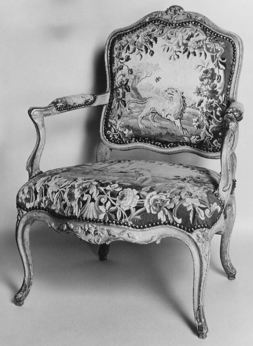 - Medium: Carved and painted walnut; Aubusson tapestry upholstery
