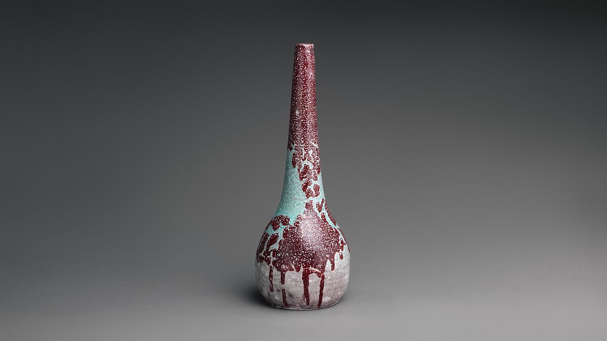 This bottle vase is decorated with a flambé glaze, a mixture of deep copper red and turquoise blue. The technique, known in China for centuries, was emulated in the nineteenth century by French art potters led by Chaplet. It involved the oxidation of copper in the kiln (reduced oxygen to create red; increased oxygen for blue). One critic wrote, "M. Chaplet, who, after thirty years of special study, also seems to have gained absolute control over his capricious materials, so that, apparently at will, he can, on a single piece, obtain the most unexpected and diverse effects of color."