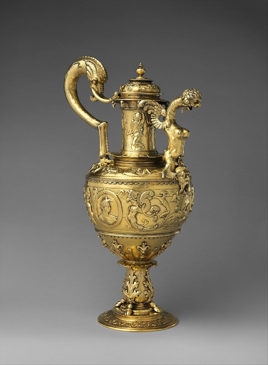 The ewer exemplifies the individual interpretation of the Renaissance style in Portugal. Its daring juxtaposition of whimsical, exotic and macabre sculptural details attests to the commanding quality of Portuguese design. By combining the extravagant and the bizarre—fabulous beasts, mythological creatures and all too mortal humans, vanitas symbols of earthly fame, beauty and of inevitable death—it mirrors perfectly the period’s taste for the odd and the unexpected that was a result of the astonishing successes of Portuguese navigators’ voyages of discovery. Very likely a royal commission, the form of the ewer is rooted in the last phase of the Manueline style, named for King Manuel I (1469–1521) that combines details of flamboyant Late Gothic architecture, Italian, as well as Flemish, elements and even references to the decoration of East Indian temples. Among the king's favored diplomatic gifts were white elephants, venerated as divine in Asia, and here alluded to in the stylized handle.