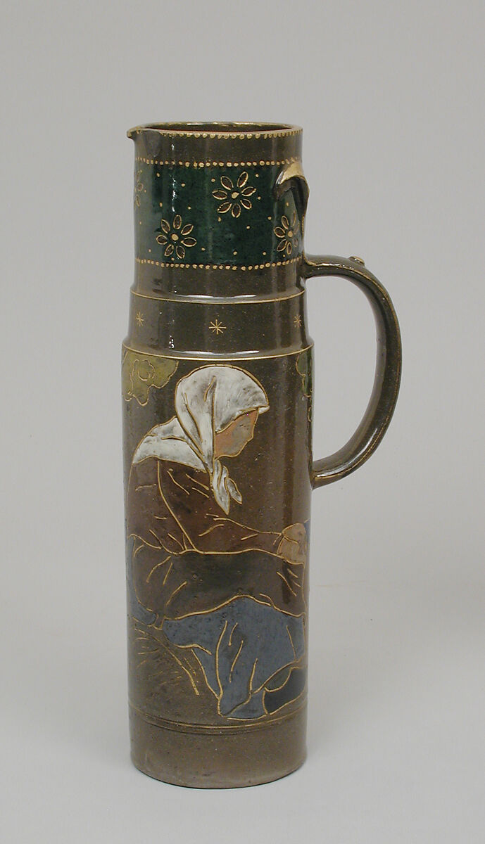 This vessel recalls sixteenth-century German salt-glazed stoneware tankards and flagons. However, the flat style of the decoration and the unmodulated use of color, particularly for the boy’s skin, are novel to the nineteenth century.