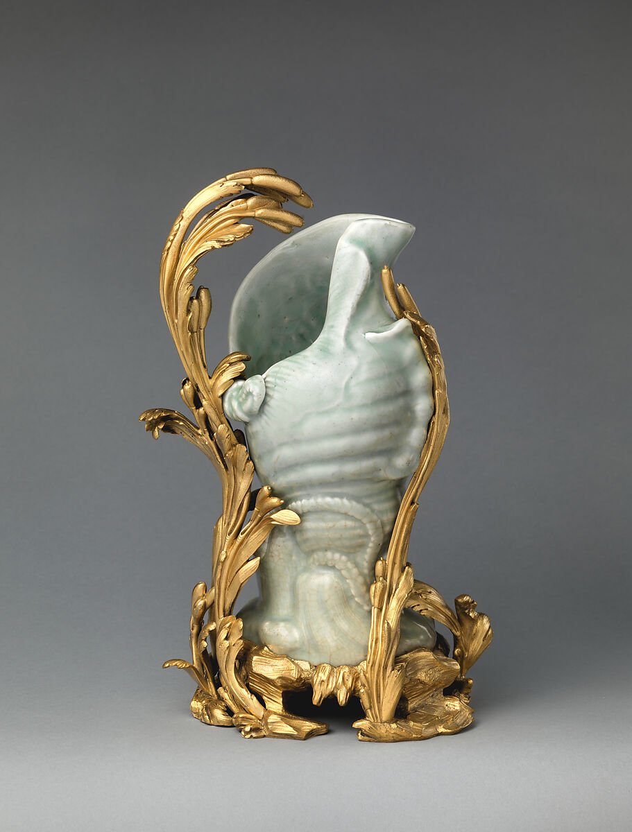 The Museum has a large and distinguished collection of Chinese celadon-glazed ceramics with eighteenth-century French gilt-bronze mounts. Both Chinese and Japanese porcelains were highly prized in eighteenth-century France, and imported porcelains were frequently mounted in gilt bronze to enhance their importance and value. While this porcelain shell has been attributed to China, it is now thought more likely to be Japanese in origin. This example of mounted porcelain is unusual due to the shell-shaped form of the porcelain, which is rare in Asian ceramics. The design of the gilt-bronze mounts accentuates the asymmetry of the shell and reflects the basic characteristics of the French rococo style – naturalistic motifs combined with C-scrolls employed in an asymmetrical design.