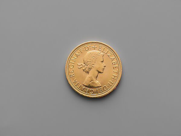 Although of twentieth-century manufacture, this Elizabeth II sovereign features the St. George reverse designed by Benedetto Pistrucci.