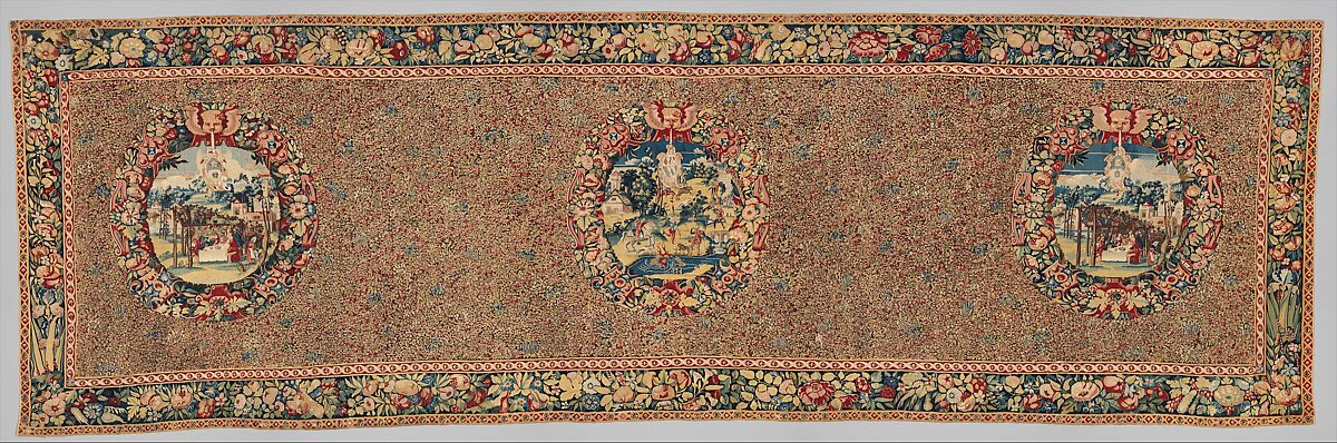 - Title: Cartouches with landscapes and armorials against a mille-fleurs ground
