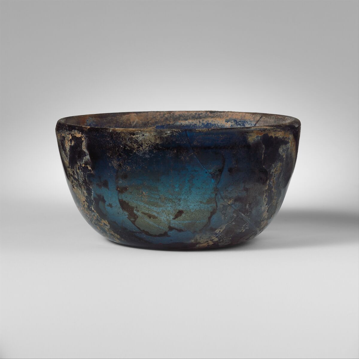 Broken and repaired, with one small area of fill at base of side; a few pinprick and larger bubbles; patches of dulling, pitting, iridescence, and creamy brown weathering.