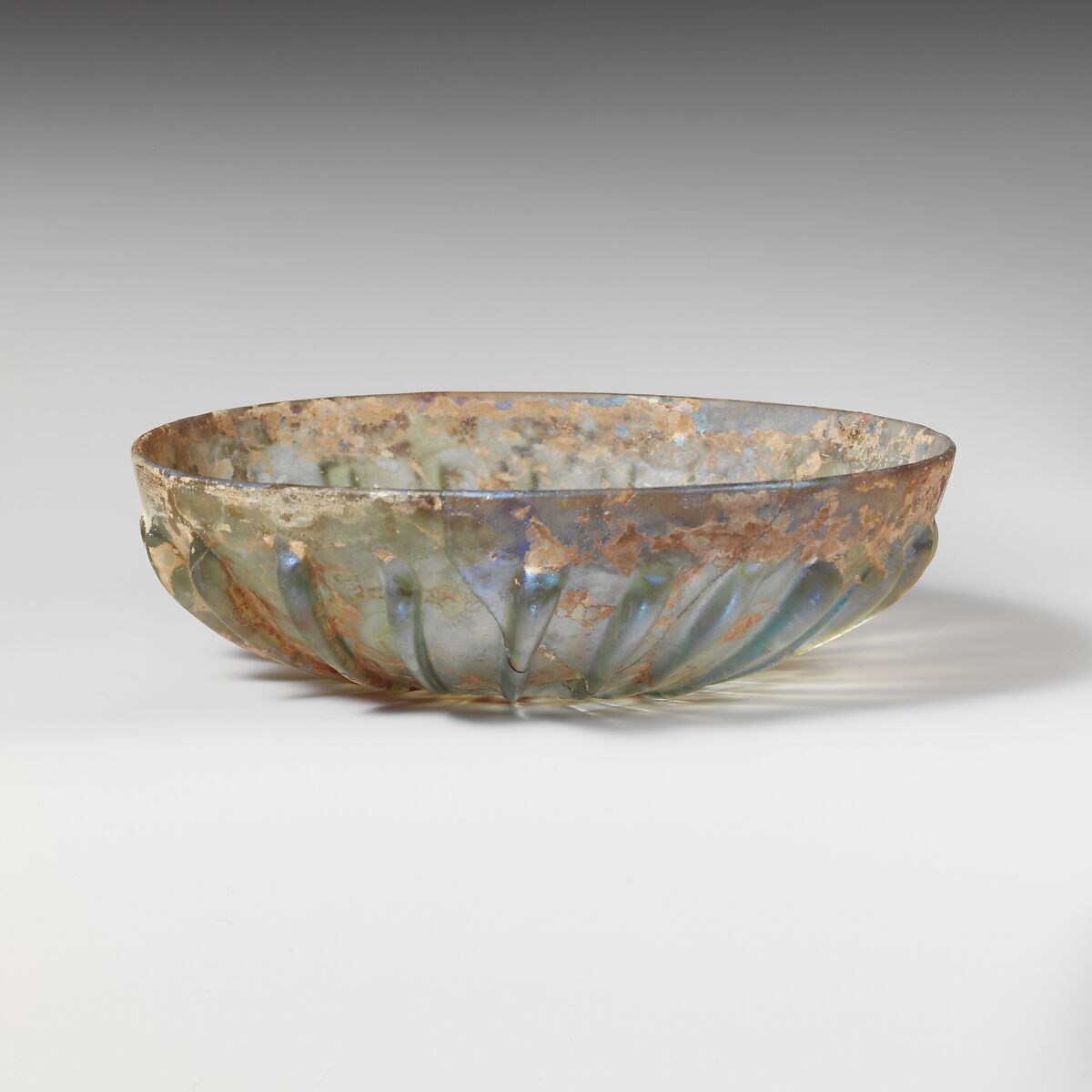 Complete; broken and repaired around one side; very few bubbles; dulling, slight pitting, and numerous patches of iridescent creamy weathering.