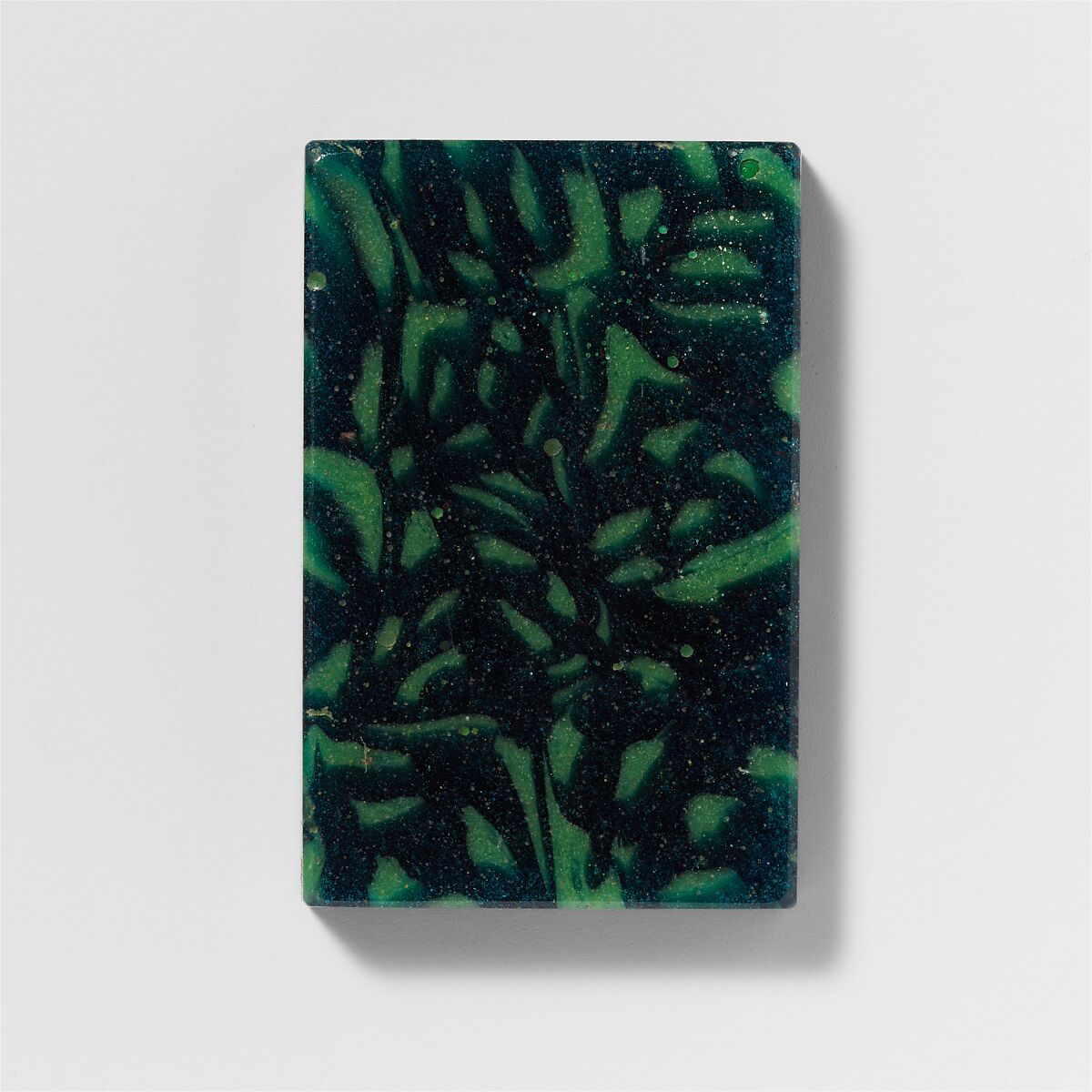Probably cut into rectangular slab and upper side and edges polished in modern times; pitting of surface bubbles, dulling and weathering on underside.