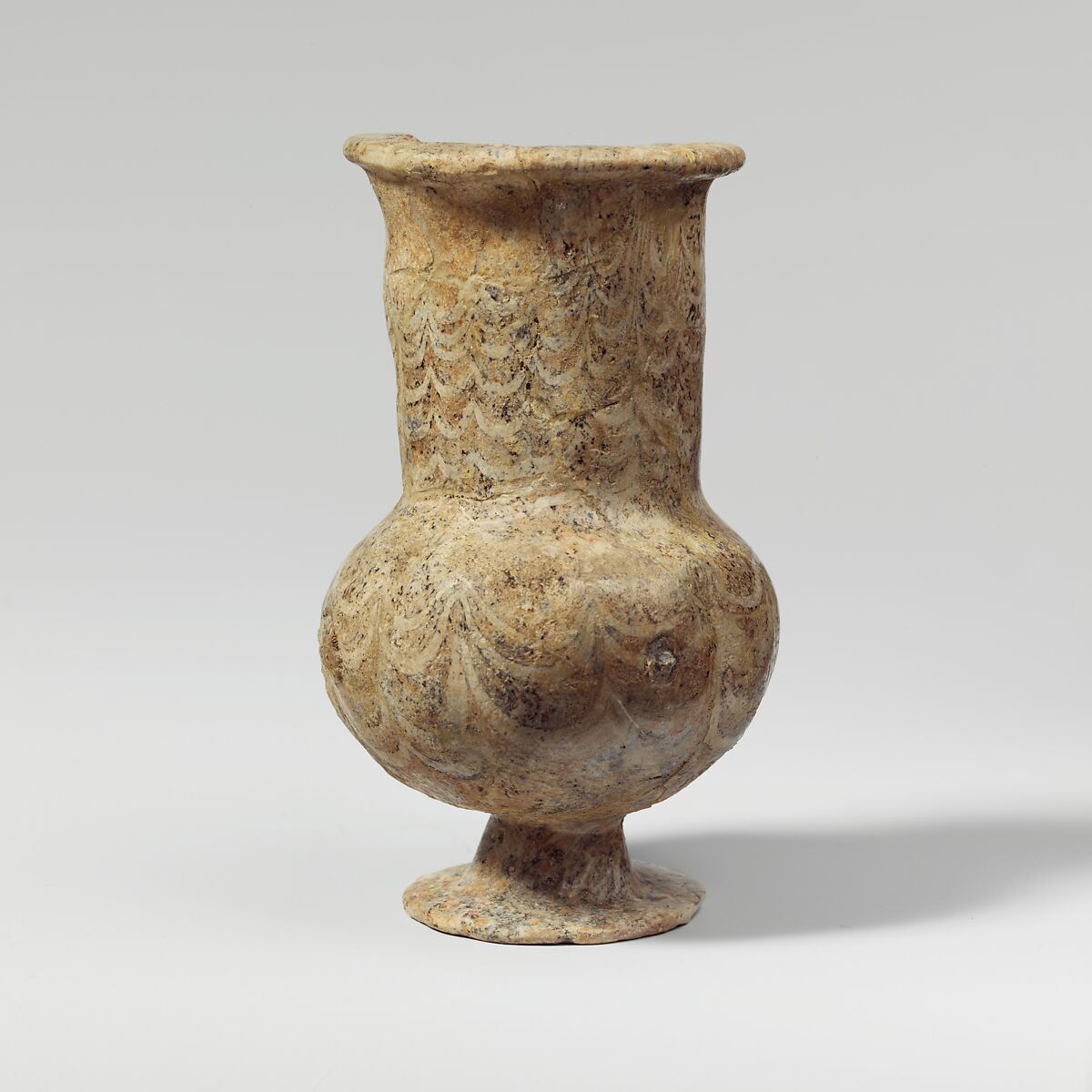 Among Bronze Age imports into Cyprus from Egypt were glass containers that held perfumes, scented oils, or cosmetics used for funeral purposes. Afterward, the jars were left in the burials. Such jars have been found on Cyprus at Kalavassos in tombs of the fourteenth century B.C. An additional example with a pristine unweathered surface can been seen nearby.