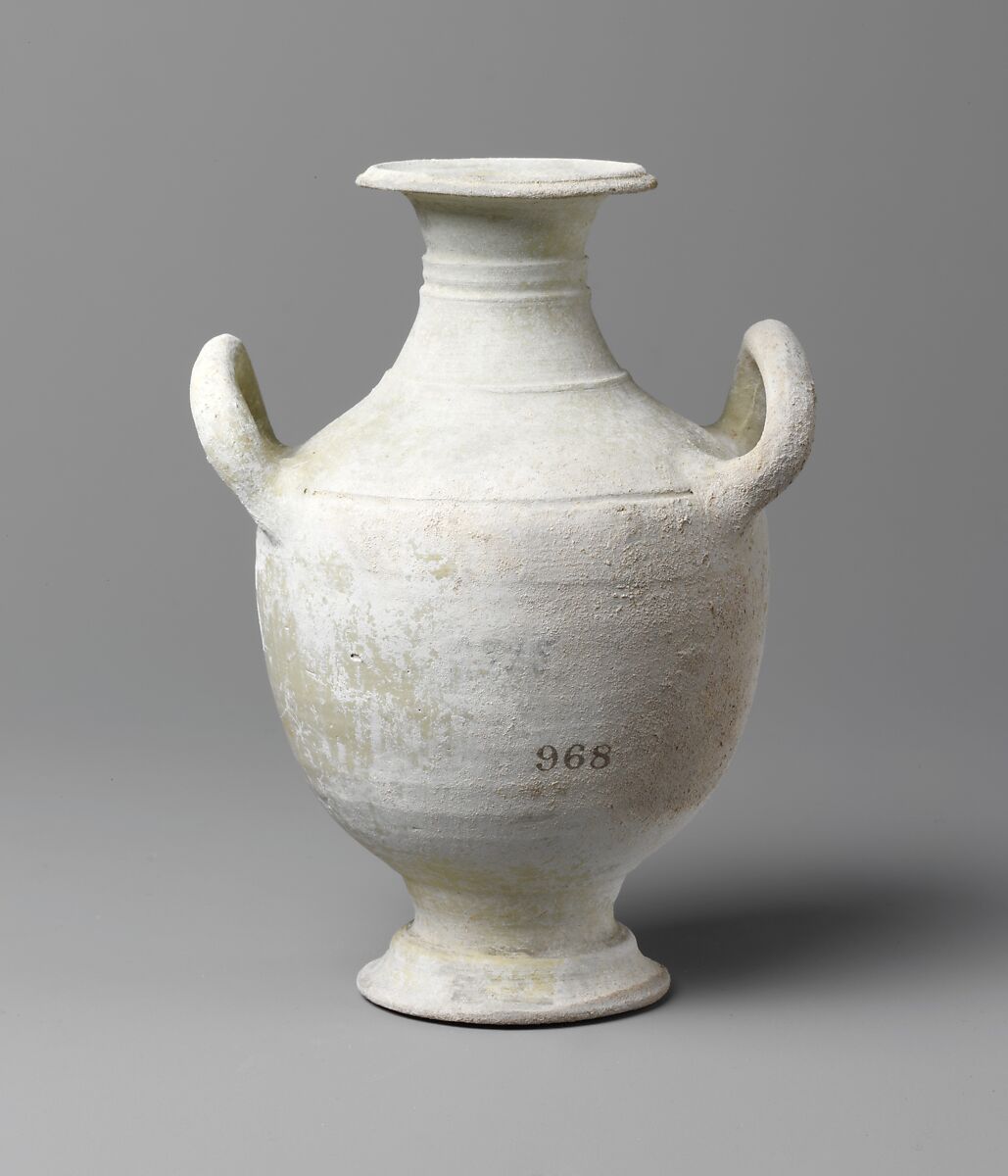 This diminutive amphora is in the "unpainted white ware" style, a descriptive term that calls attention to the plain light colored ground that lacks decoration. Excavation of tombs in Cyprus have brought to light numerous ceramic vessels in this style, suggesting that plain white ware was deemed especially appropriate for burial. Although this amphora is unpainted it exudes an aire of luxury; for its crisp potting, small scale, and smooth white surface may recall vessels made in alabaster, a popular medium in Cyprus.