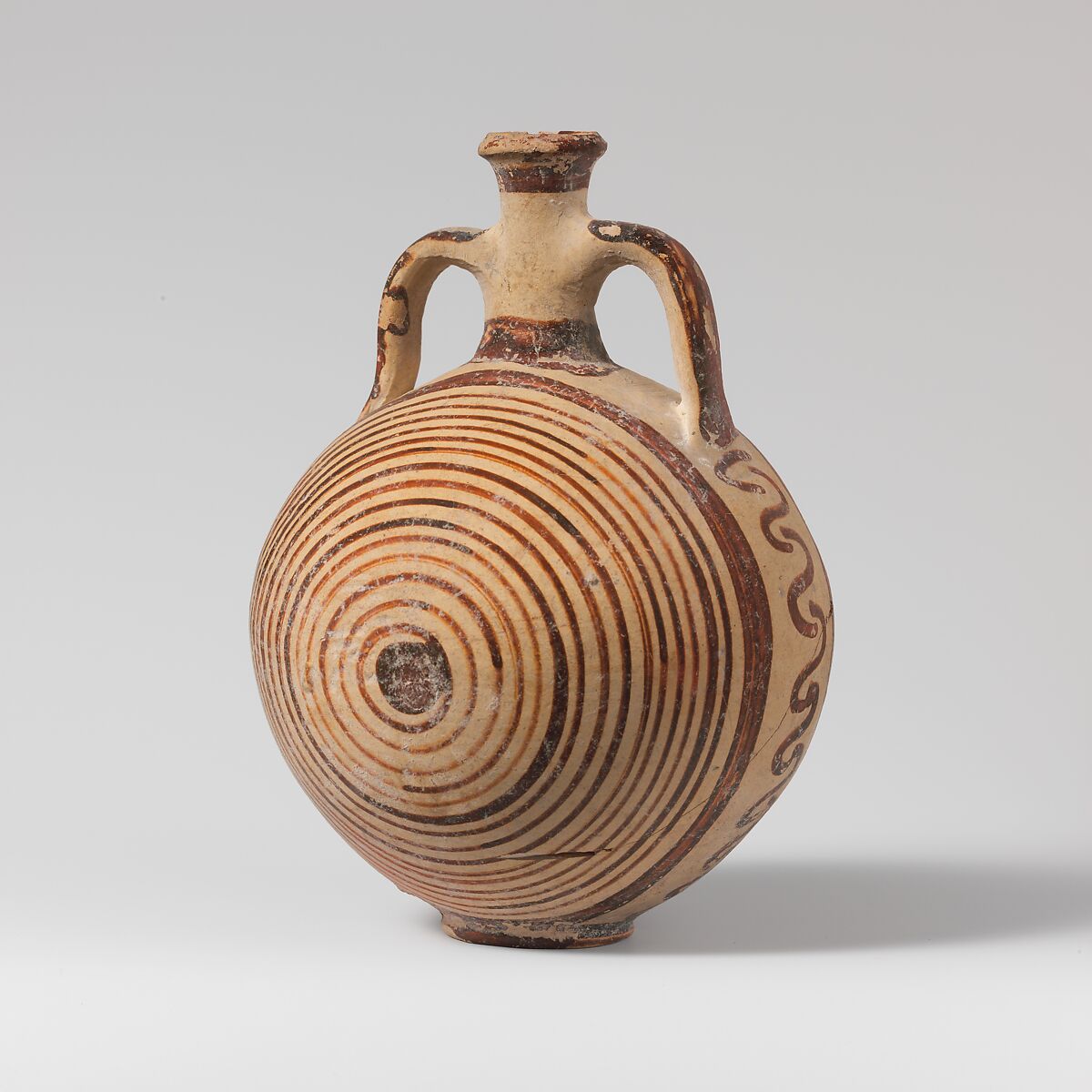 Globular bottle with two handles, concentric circles and two chains of loops.