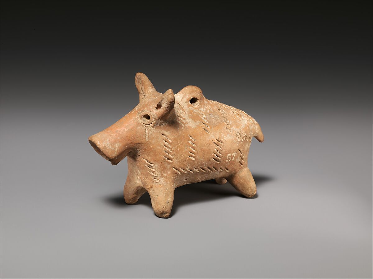 Terracotta figurines of animals usually appear as part of the decoration on the rims of large bowls or the shoulders of vases. Freestanding figurines such as this one are rare.