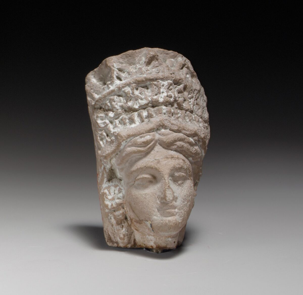 The head, of the Kition goddess type, is mold-made and solid. The back is handmade, flattened, and concave behind the headdress; the head is rather shallow. The head and the upper part of the neck are preserved.