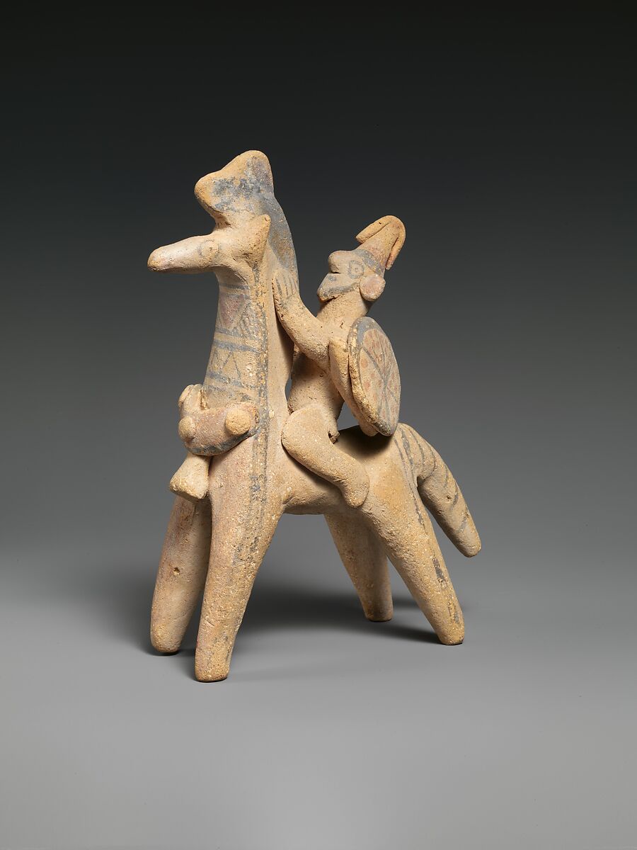 The rider here is a warrior equipped with crested helmet and shield. The horse has a topknot, thick tail, and tasseled frontlet on its chest. These features are characteristic of the horses from Kourion that have been found in great number at the sanctuary of Apollo Hylates. Warrior iconography was particularly suitable for a male divinity.