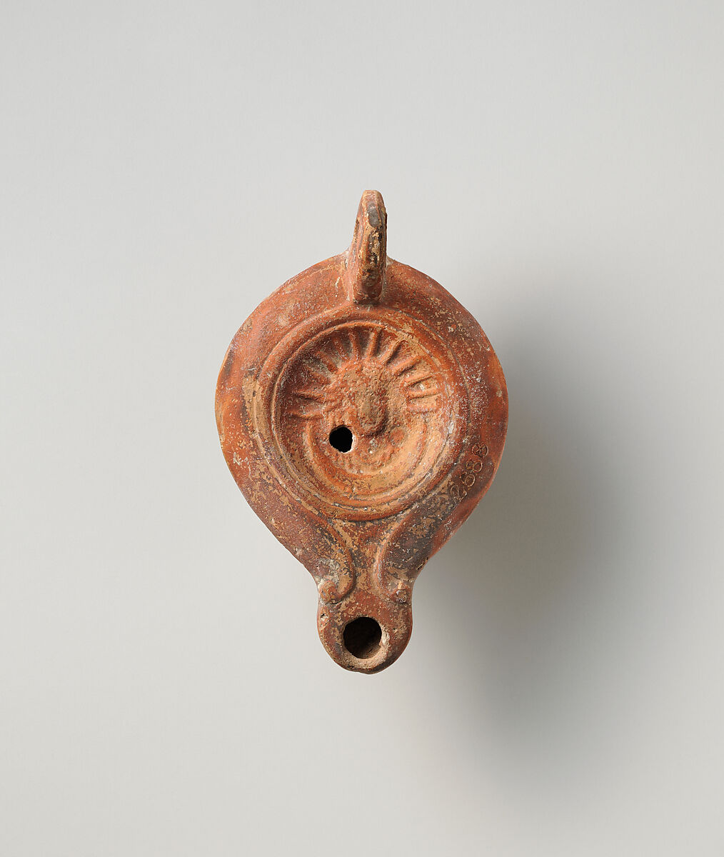 Loeschcke Type 4. Mold-made, with ring handle. Discus: radiate head of Helios (Sol), facing, and lunar crescent below; a single filling hole at lower left, and a band comprising a single raised line flanked by two grooves around discus; plain, slightly sloping shoulder, ending in simplified volutes at nozzle. Incised base ring, and uneven, hollow base.