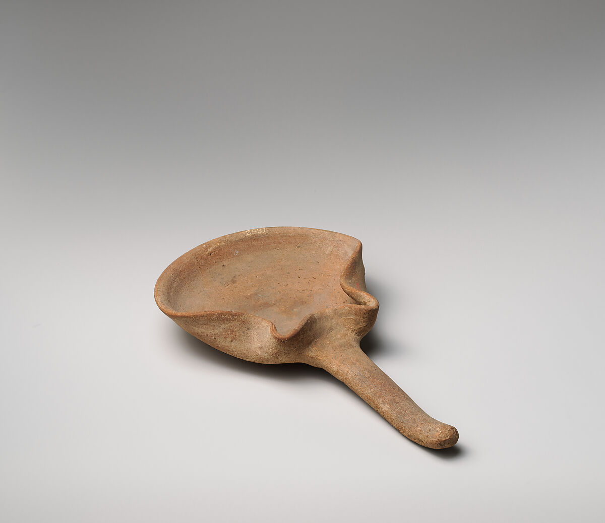 Wheel-made with edge folded in to form two wick rests; thick, flaring rim, with beveled lip; shallow, sloping, open body; between nozzles, a solid handle, tapering slightly and upturned at rounded end; undefined, convex base.