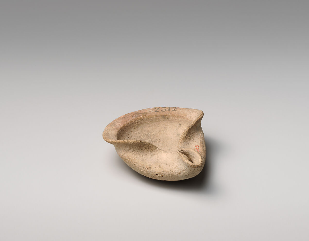 Wheel-made with edge folded in to form a narrow wick rest; broad, horizontal rim, with rounded lip; deep, concave, open body; undefined, convex base.