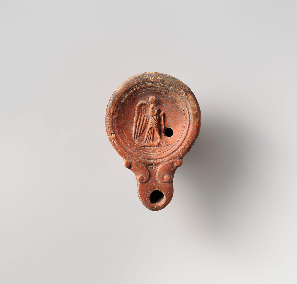 Loeschcke Type 4. Mold-made. Discus: winged, draped siren, standing and facing right, with large bird's claw feet, long wing behind her back, and holding a lyre (?) at her side; a single filling hole at bottom right; band of lines and grooves towards edge. Incised base ring, and uneven, raised base.