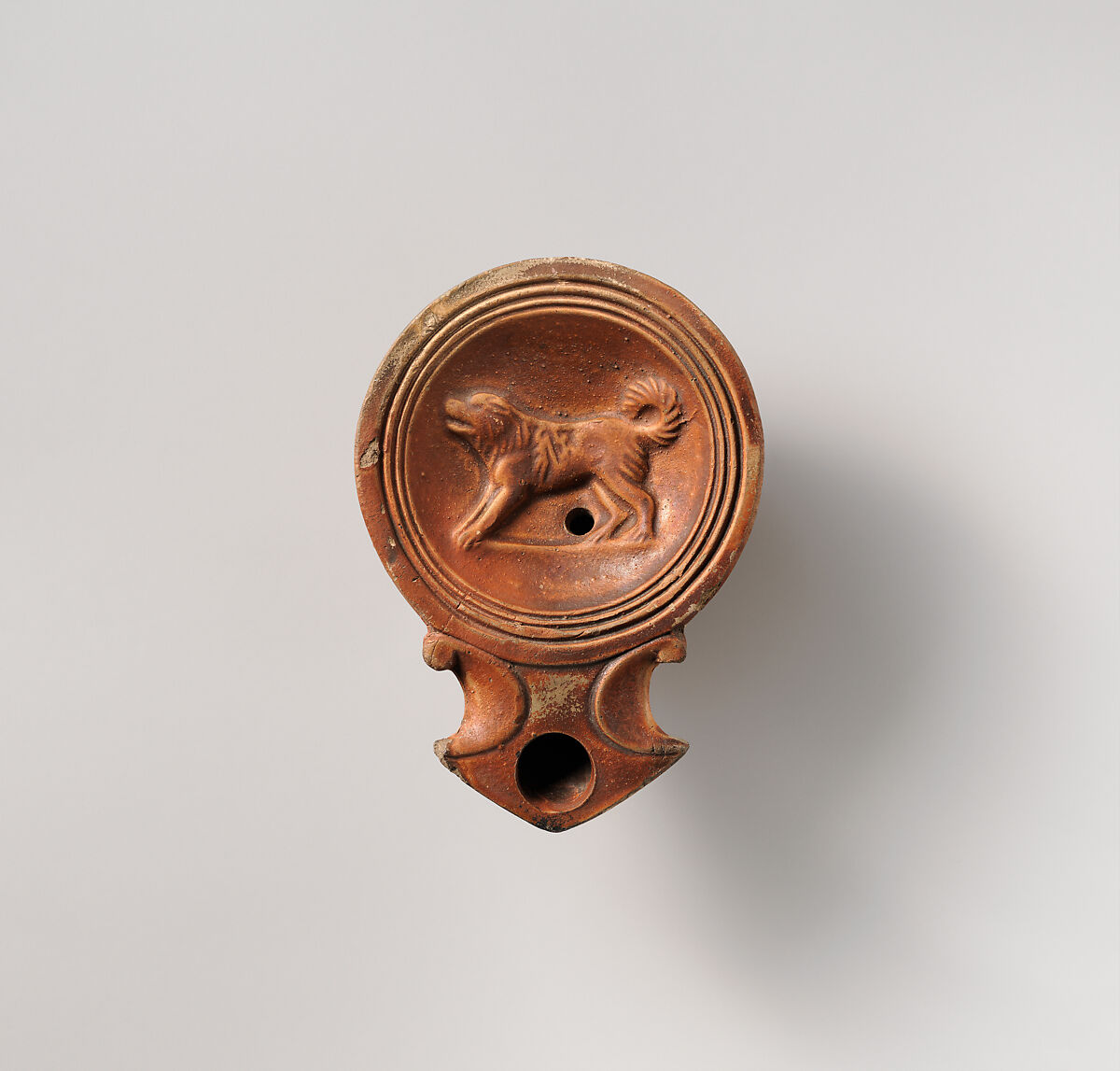 Loeschcke Type 1A. Mold-made. Discus: large dog standing to left, with curly tail; ground line below; single filling hole in front of the dog's rear legs, with a broad band of lines and grooves at edge. Volutes flanking angular nozzle. Raised base ring, and flat base.
