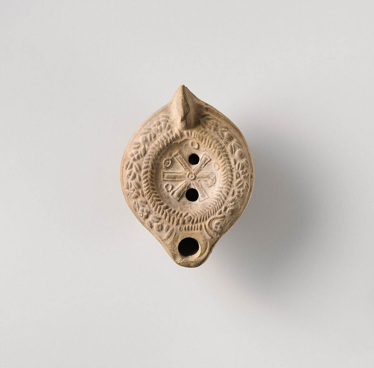 Vessberg Type 18. Mold-made, with unpierced handle. Discus: chi-rho, with top at right, decorated with a central dot and circle, and similar circles between the arms. Two filling holes. Shoulder: herring-bone wreath surrounded by a vegetal pattern. Undefined, concave base.