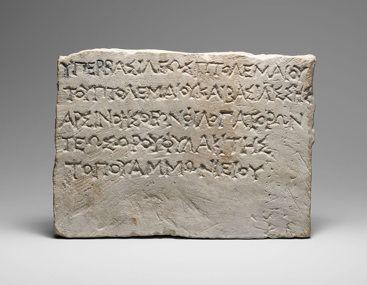 Dedication to Ptolemy IV Philopator (r. 221–204 B.C.) and his sister, Queen Arsinoe, by Teos, son of Horos, who was a guard at the site of Ammonieion, possibly the Temple of Ammon, near Thebes in Upper Egypt.
