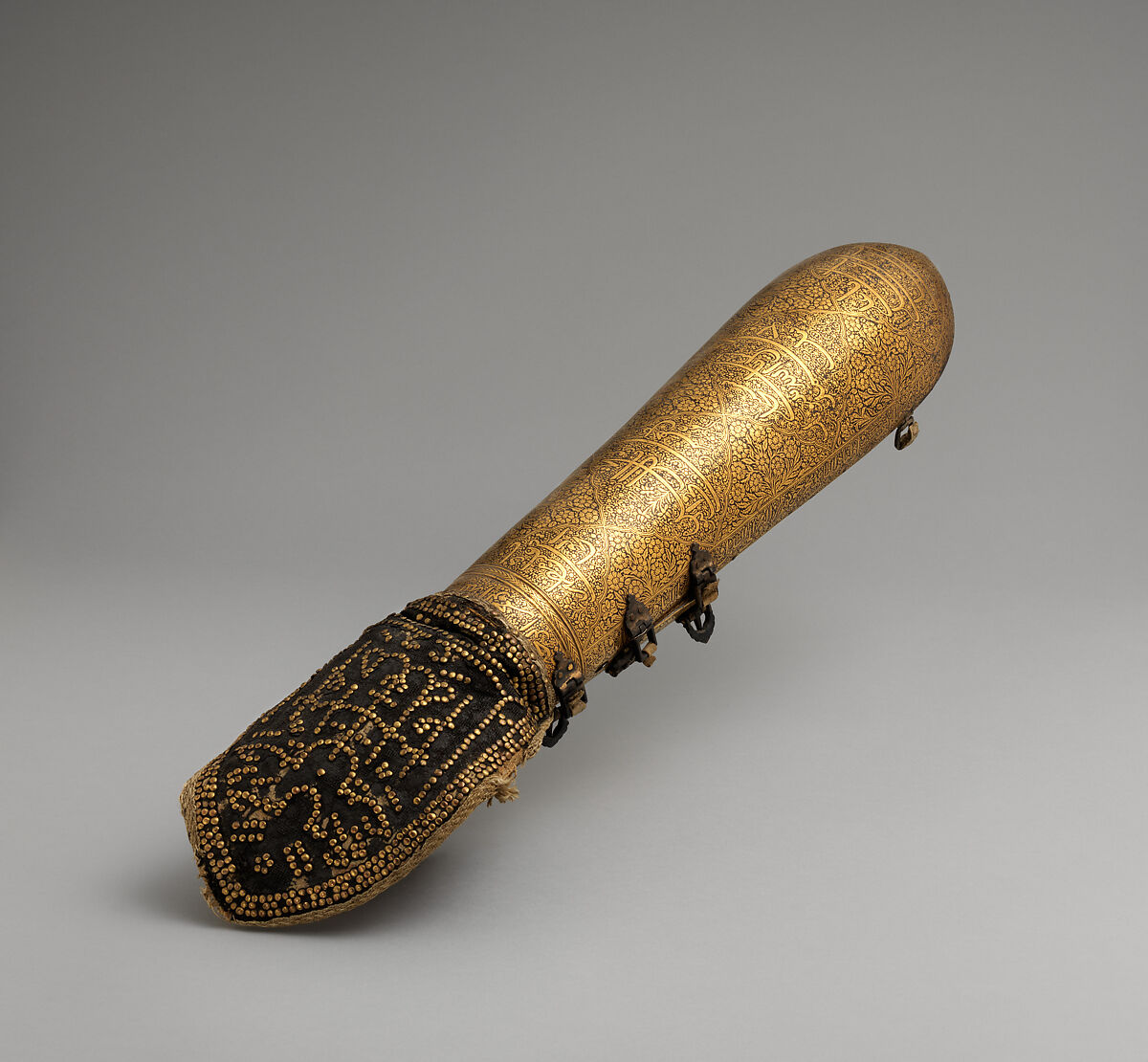 This type of arm guard, known as a dastana, was used throughout Turkey, Iran, and India. Its curved plate protected the outside of the forearm and is connected to a pair of shorter plates that guarded the inside of the wrist. The inscriptions on this example are incorporated into the gold decoration and the nail-head design on the mitten and include Qur’anic verses and the popular Shi‘i prayer Nad-i ‘Ali (Call upon ‘Ali).