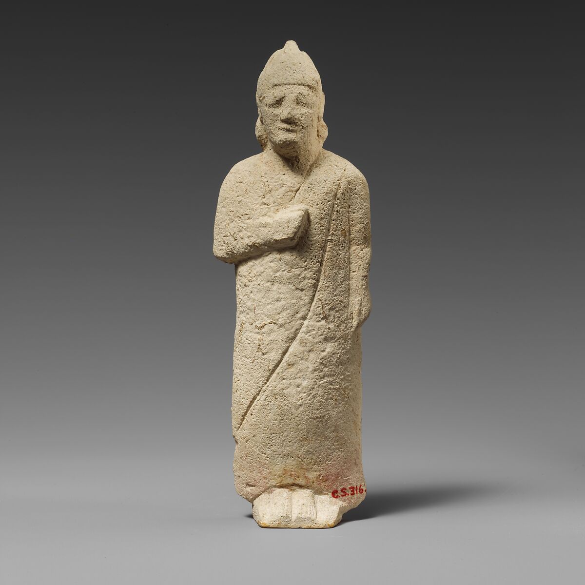 - Title: Limestone statuette of a beardless male votary with a conical helmet