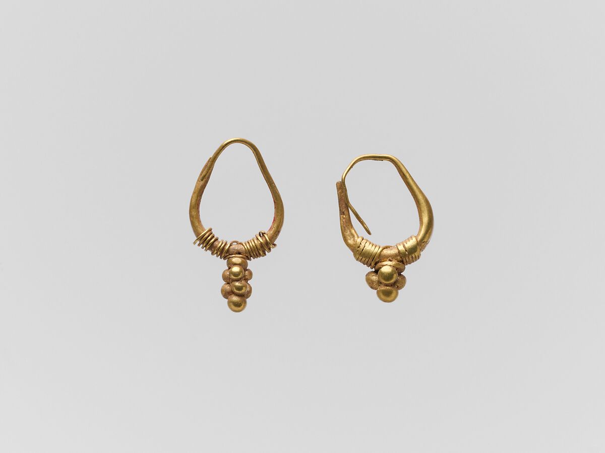 The hoop is slender; at the lowest point is a cluster of hollow gold balls, rendered as if attached to the hoop by a lashing gold wire.