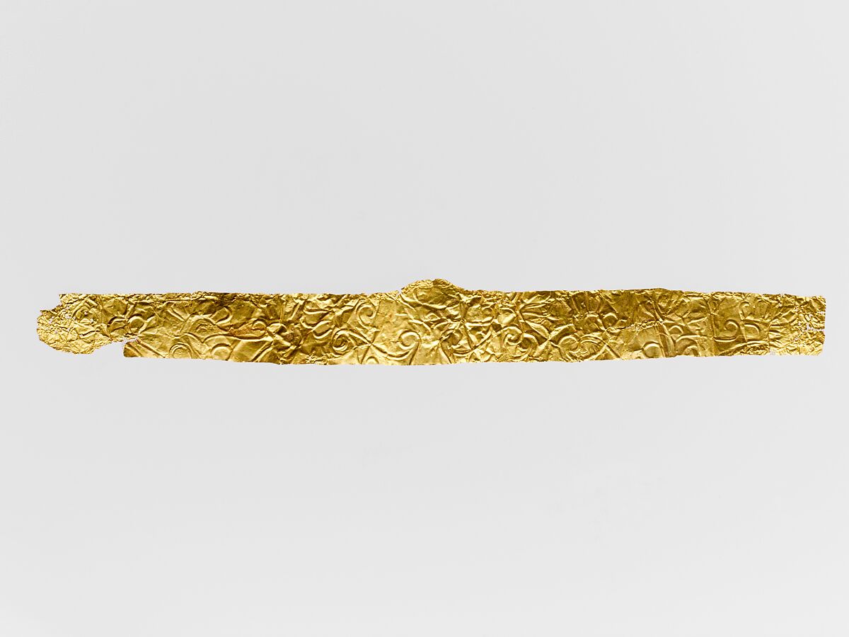The gold foil of which the diadem is made indicates that its use was exclusively funerary. The repoussé decoration was evidently applied to a larger sheet of foil from which the diadem was cut.