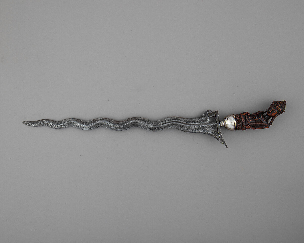 The kris, with its sinuous, snakelike blade, is the most characteristic weapon of Indonesia. Considered from early times to be imbued with great spiritual power, it is still an integral part of Indonesian culture. Figural kris hilts are associated in particular with Bali, where the traditions of Hindu art continued uninterrupted despite the influence of Islam, and with nearby eastern Java. Although the identity of some hilt figures is uncertain, many appear to be inspired by characters and episodes from the Māhābharata and the Rāmāyana. The profound impact of these great literary epics on Indonesian life, from as early as the tenth century until the present day, cannot be overestimated. The finely carved wood hilt of this kris has been thought to represent Krishna, an immensely popular Hindu god and a key figure in the Māhābharata. It seems more likely, however, that it depicts Krishna's companion Arjuna, prince of the Pāndava family and the most renowned epic character in Indonesia.