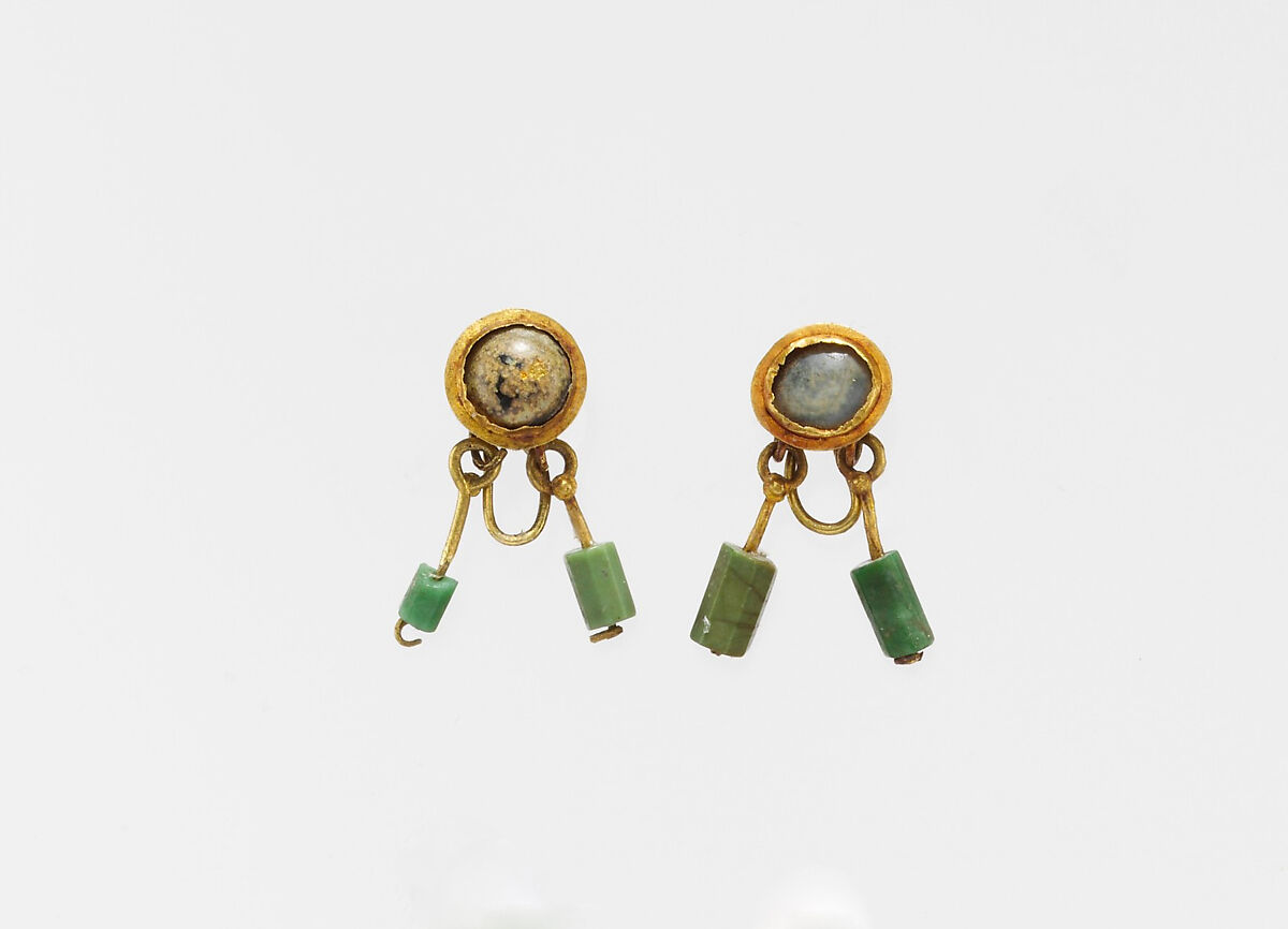 Pair of gold earrings with glass and green chalcedony adjuncts.