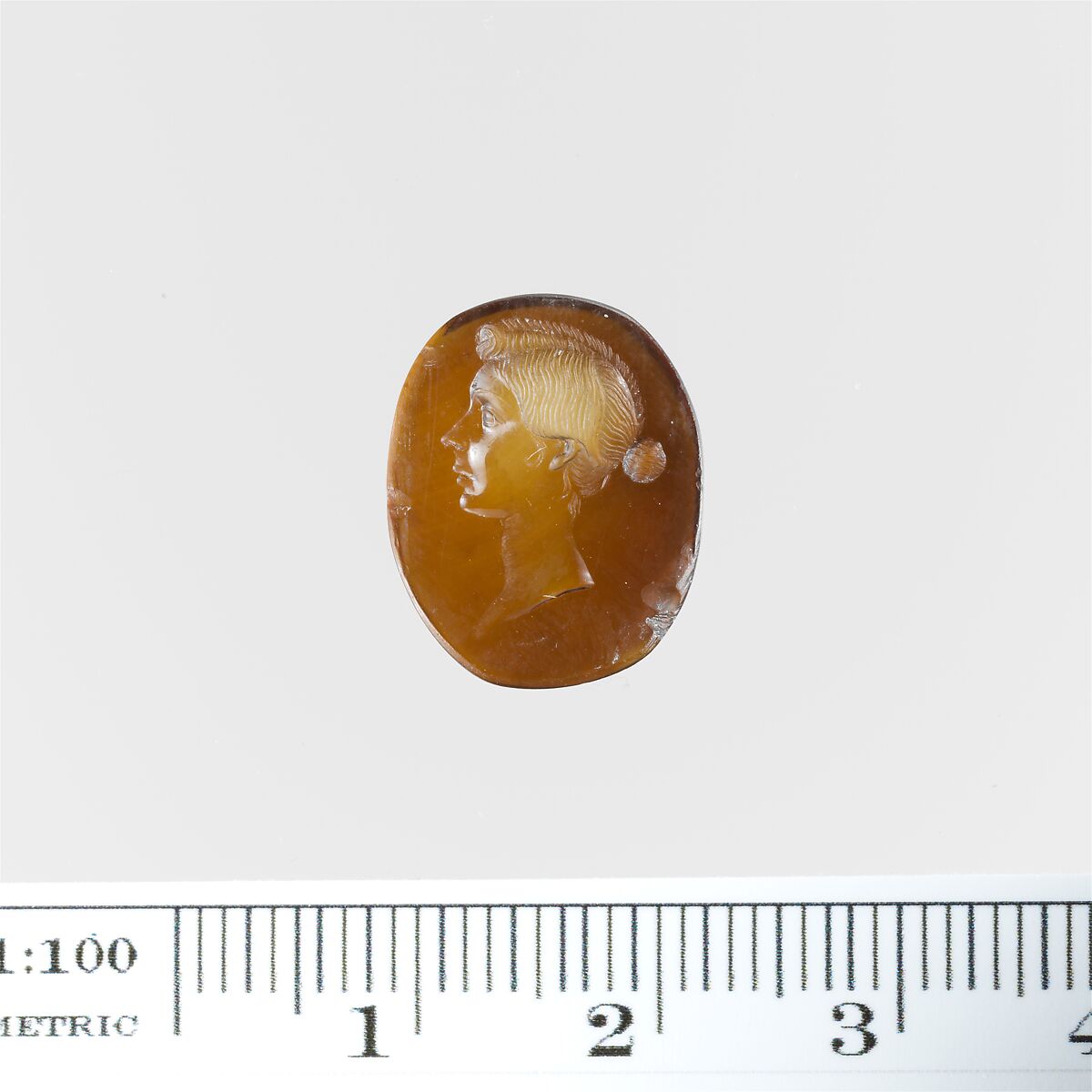 The hairstyle, with a "French roll" on top of the head and a small chignon at the back, was in fashion during the Augustan period and occurs on coins of Octavia and Fulvia.