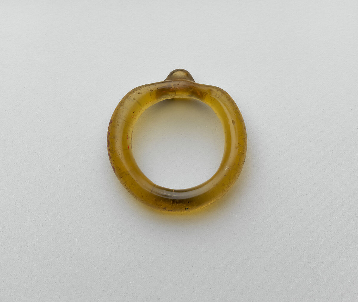 Circular cross section to hoop with round finger hole; slightly wider, flattened oval bezel decorated with projecting hemispherical knob.