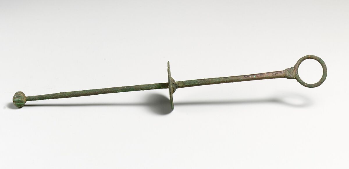 This instrument was used for mixing ointments or cosmetics. The central disk both served as a lid for the bottle containing the mixture and helped to keep the rod upright.